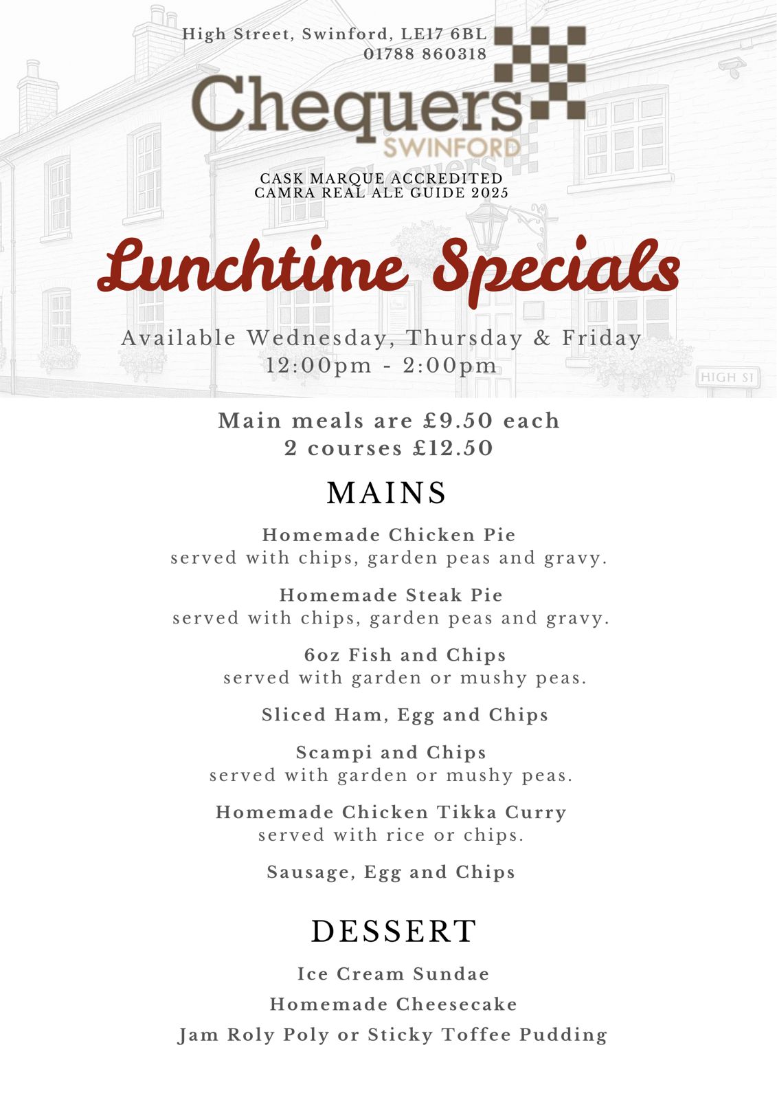 The Chequers caters for all ages and possesses a large garden with a variety of children’s play equipment and toddler facilities. We also serve a range of lagers, draft ales and fine wines.